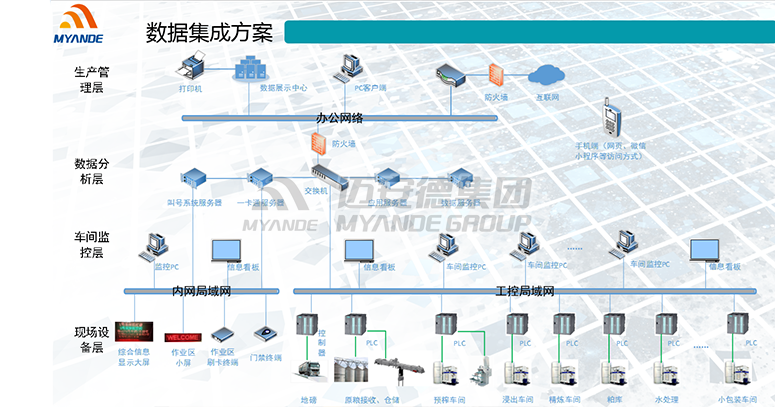 邁安德基于最新的工業4.0理念,通過工廠內部網絡,對各車間生產數據通過PLC進行采集,與實際業務數據(采購、原料、批次、運輸、生產、化驗、倉儲、銷售、財務等)充分結合,運用數據整合、報表分析使客戶實現全廠生產運營過程的自動化、透明化、可視化、精益化、數據化,打造全新的智能化工廠。